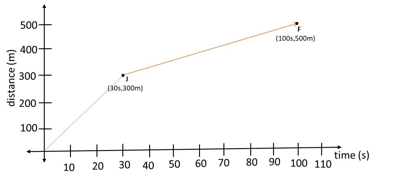 A car starts from rest and arrives at a point J which is 300m from where it started in 30 seconds. At the 100th second, it reaches a point F which is 500m from his starting point. Calculate the average speed of the car.