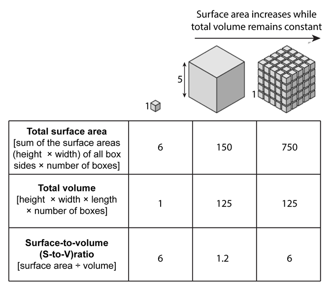Draw a simplified elongated cell that measures arbitrary units. A nerve cell would be roughly this shape. Predict how its surface-to-volume ratio would compare with those in Figure 6.7. Then calculate the ratio and check your prediction.