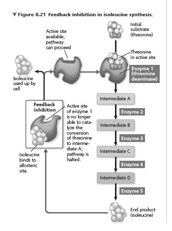 How does negative feedback in thermoregulation differ from feedback inhibition in an enzyme-catalyzed biosynthetic process (see Figure 8.21)