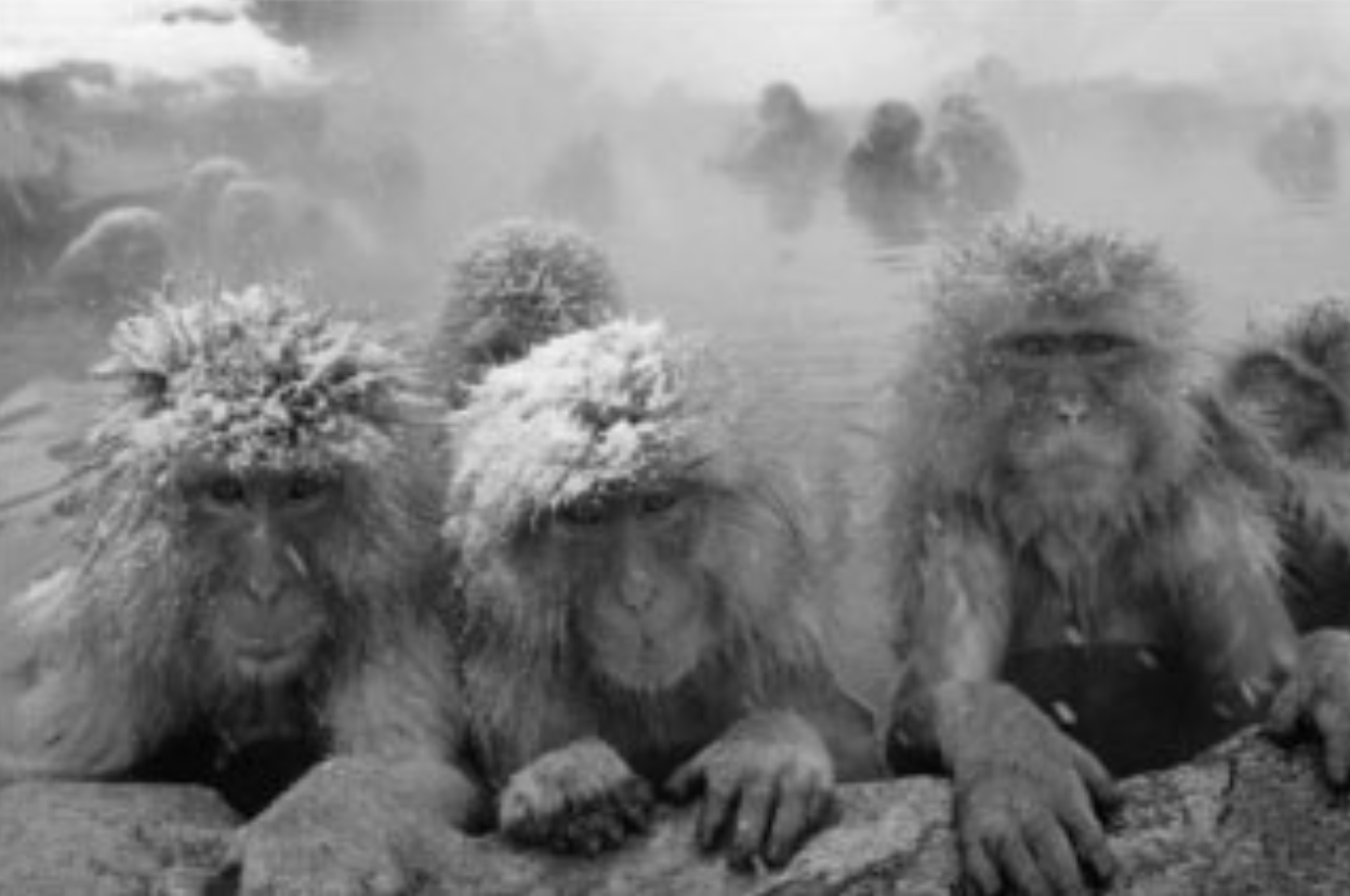These macaques (Macaca fuscata) are partially immersed in a hot spring in a snowy region of Japan. What are some ways that form, function, and behavior contribute to homeostasis for these animals?