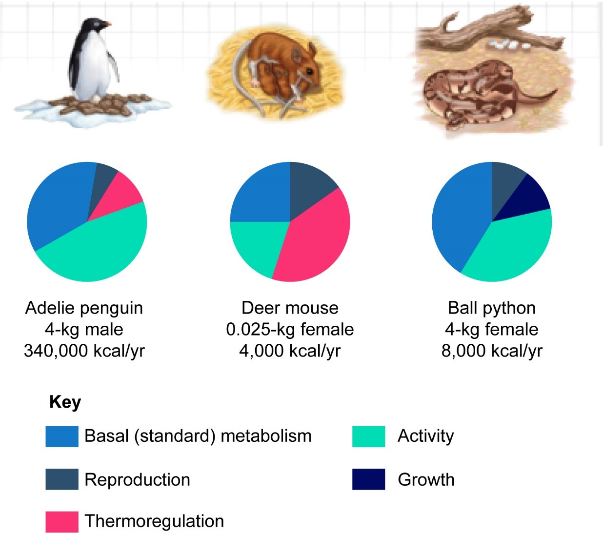 You can estimate the contribution of each wedge in a pie chart by remembering that the entire circle represents 100%, half is 50%, and so on. What percent of the mouse's energy budget goes to basal metabolism? What percent of the penguin's budget is for activity?