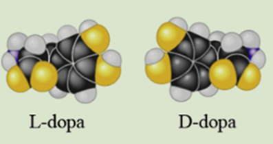 In 1918, an epidemic of sleeping sickness caused an unusual rigid paralysis in some survivors, similar to symptoms of advanced Parkinson’s disease. Years later, L-dopa (below, left), a chemical used to treat Parkinson’s disease, was given to some of these patients. L-dopa as remarkably effective at eliminating the paralysis, at least temporarily. However, its enantiomer, D-dopa (right), was subsequently shown to have no effect at all, as is the case for Parkinson’s disease. In a short essay (100-150 words), discuss how the effectiveness of one enantiomer and not the other illustrates the theme of structure and function.