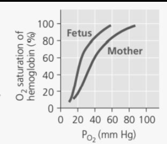 The hemoglobin of a human fetus differs from adult hemoglobin. Compare the dissociation curves of the two hemoglobins in the graph at right. Describe how they differ and propose a hypothesis to explain the benefit of this difference.