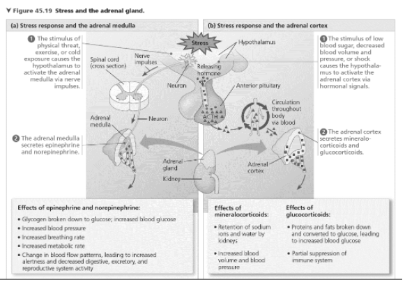 Most tissues regulated by the autonomic nervous system receive both sympathetic and para sympathetic input from postganglionic neurons. Responses are typically local. In contrast, the adrenal medulla receives input only from the sympathetic division and only from preganglionic neurons, yet responses are observed throughout the body. Explain why (see Figure 45.19).