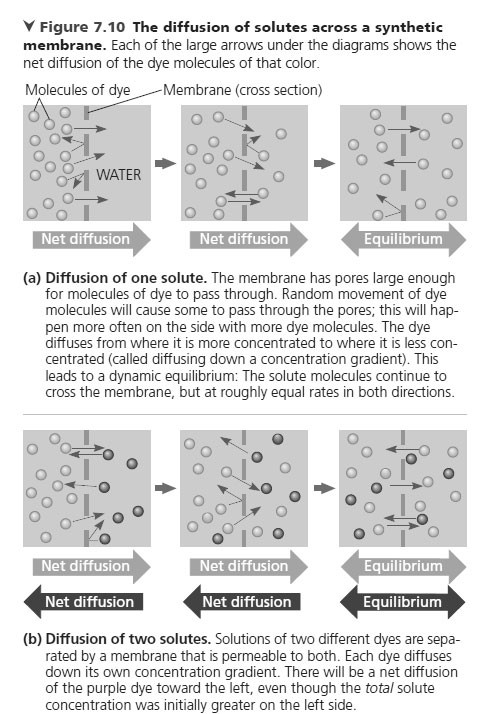 MAKE CONNECTIONS Review Figure 7.10, which illustrates the diffusion of dye molecules across a membrane.Could diffusion eliminate the concentration gradient of a dye that has a net charge? Explain.