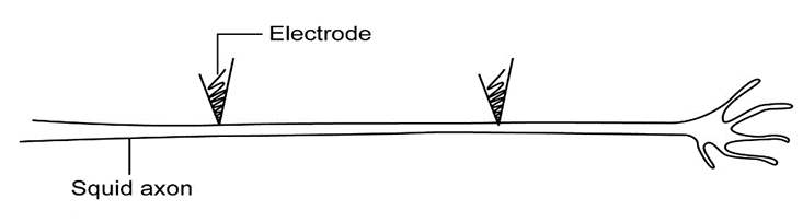 Suppose a researcher inserts a pair of electrodes attwo different positions along the middle of an axon dissectedout of a squid. By applying a depolarizing stimulus, theresearcher brings the plasma membrane at both positionstothreshold. Using the drawing below as a model, create oneor more drawings that illustrate where each action potentialwould terminate.