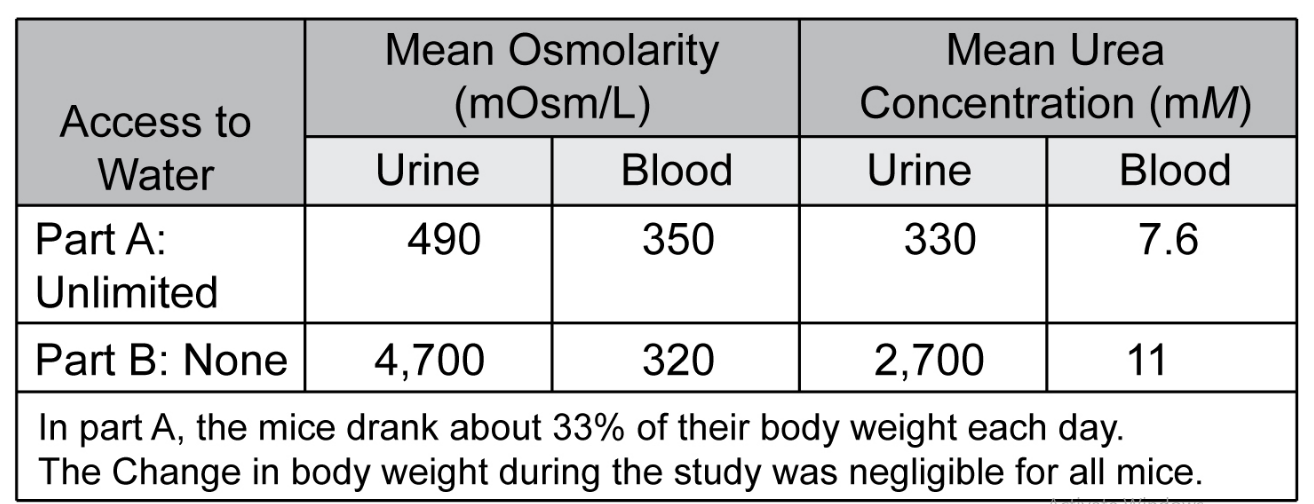 (a) Calculate the ratio of urine osmolarity to blood osmolarity for mice with unlimited access to water. (b) Calculate this ratio for mice with no access to water. (c) What conclusion would you draw from these ratios?