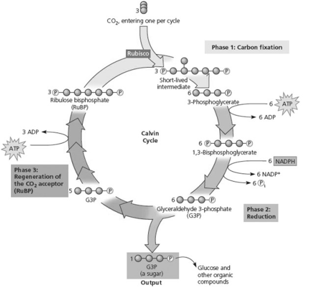 To synthesize one glucose molecule, the Calvin cycle uses __________molecules of CO2, _________molecules of ATP, and ________molecules of NADPH.