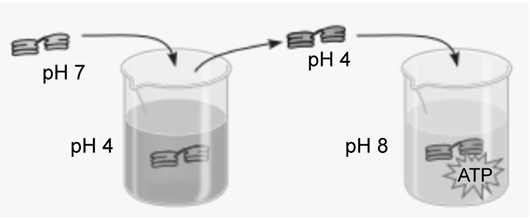 The following diagram represents an experiment with isolated thylakoids. The thylakoids were first made acidic by soaking them in a solution at pH 4. After the thylakoid space reached pH 4, the thylakoids were transferred to a basic solution at pH 8. The thylakoids then made ATP in the dark. (See Concept 3.3 to review pH.).