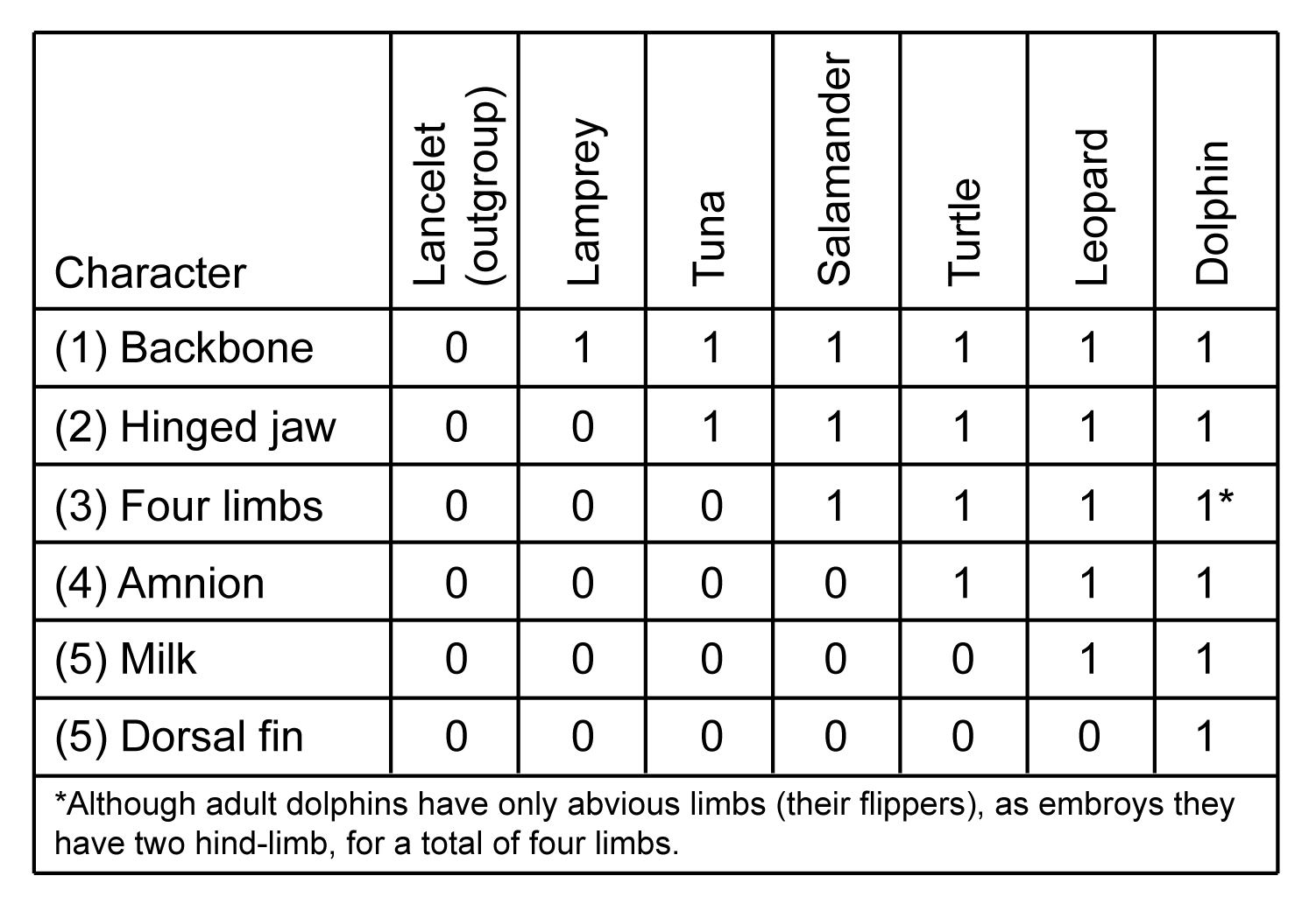 SCIENTIFIC INQUIRY • DRAW IT (a) Draw a phylogenetic tree based on characters 1–5 in the table below. Place hatch marks on the tree to indicate the origin(s) of characters 1–6. (b) Assume that tuna and dolphins are sister species and redraw the phylogenetic tree accordingly. Use hatch marks to indicate the origin(s) of characters 1–6. (c) Determine how many evolutionary changes are required in each tree. Identify the most parsimonious tree.