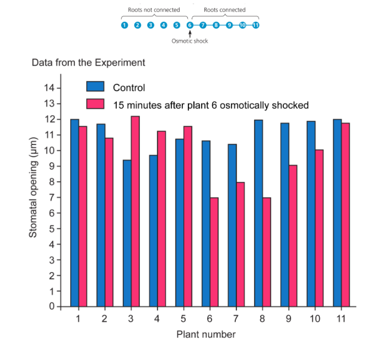 When the experiment was run for 1 hour rather than 15 minutes, the results were about the same except that the stomatal openings of plants 9鈥11 were comparable to those of plants 6鈥8. Suggest a reason why.