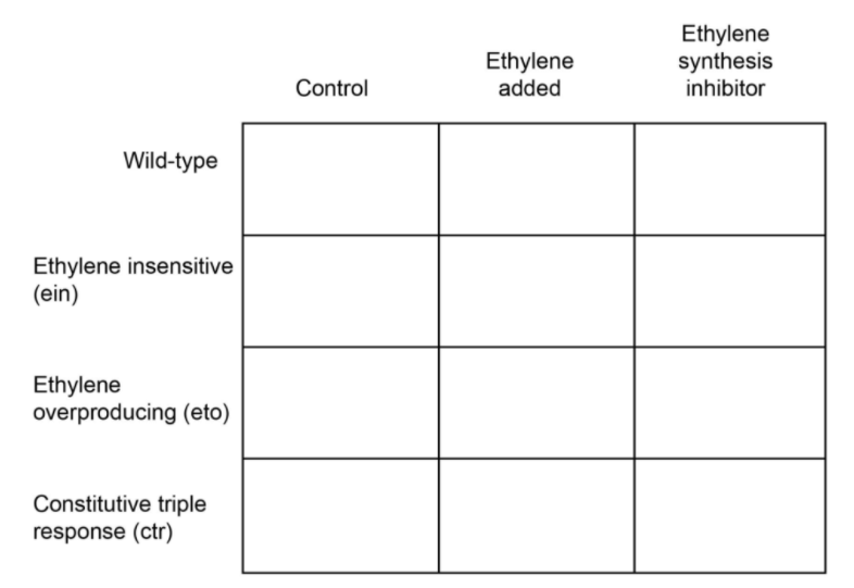 Indicate the response to each condition by drawing a straight seedling or one with the triple response.