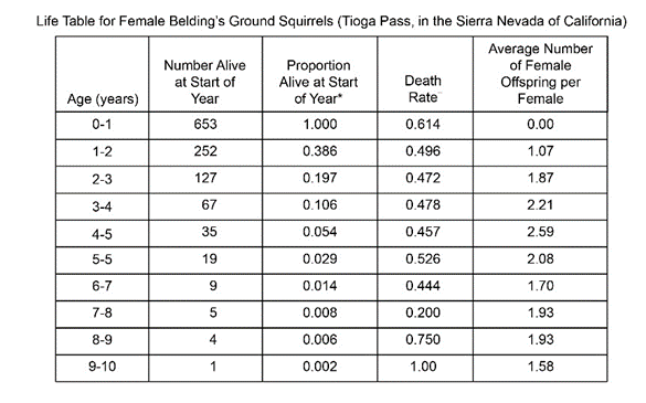 To estimate which age cohort in a population of females produces the most female offspring, you need information about the number of offspring produced per capita within that cohort and the number of individuals alive in the cohort. Make this estimate for Belding’s ground squirrels by multiplying the number of females alive at the start of the year (column 2 in Table 53.1) by the average number of female offspring produced per female (column 5 in Table 53.1). Draw a bar graph with female age in years on the x-axis (0–1, 1–2, and so on) and total number of female offspring produced for each age cohort on the y-axis. Which cohort of female Belding’s ground squirrels produces the most female young?