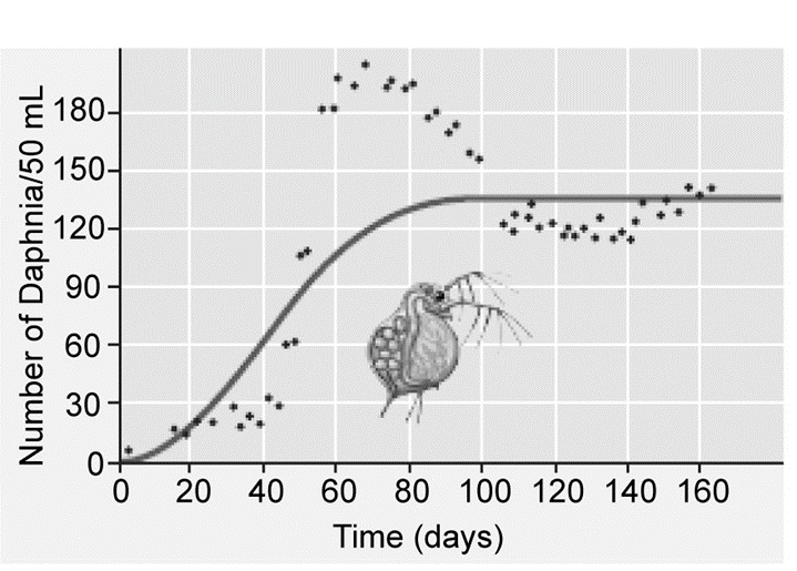 Now let’s see how the growth of a real-world population of Daphniacorresponds to this model. At what times in Figure 53.11b is the Daphniapopulation changing in ways that correspond to the values you calculated? Hypothesize why the population drops below the carrying capacity briefly late in the experiment.