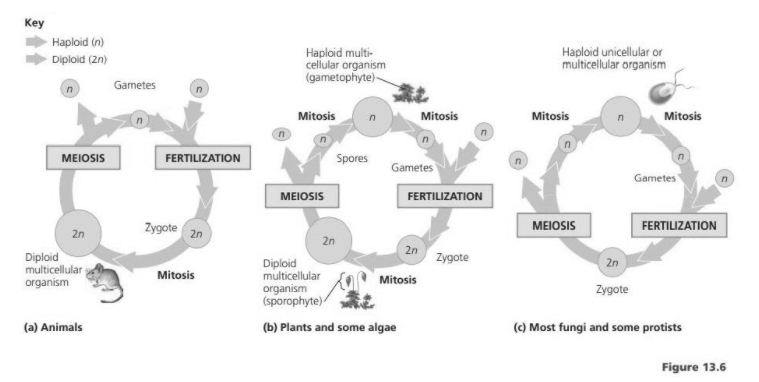 Which of the three life cycles in Figure 13.6 exhibits alternation of generations? How does it differ from the other two?