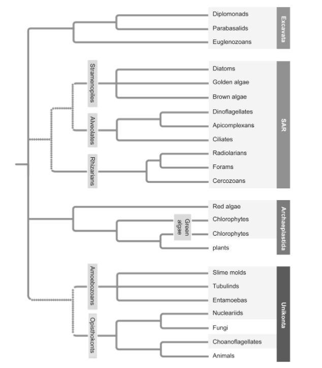 Recent evidence indicates that the root of the eukaryotic tree may lie between a clade that includes unikonts and excavates, and all other eukaryotes. Draw the tree suggested by this result.