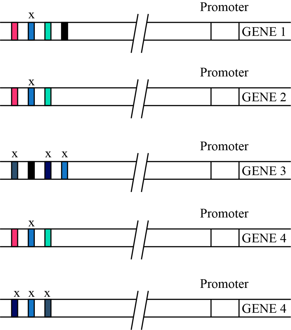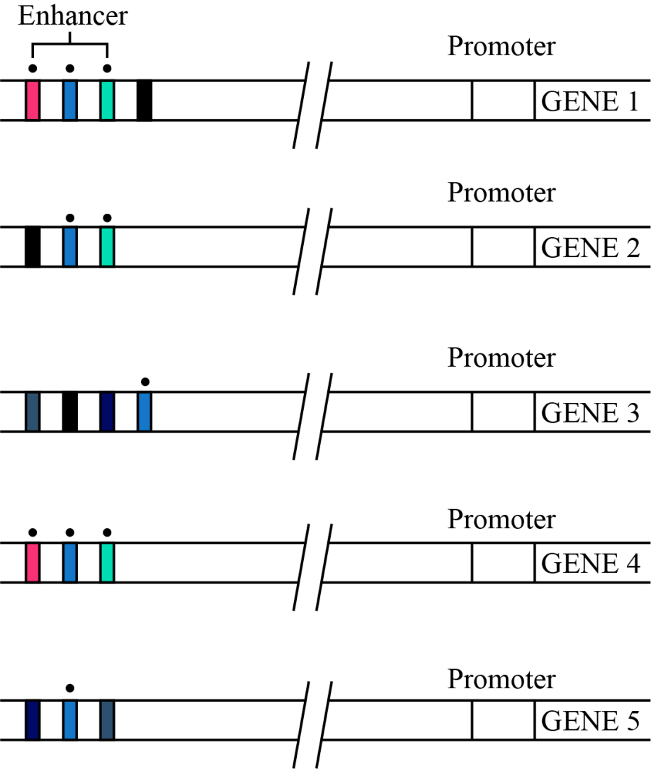 The diagram below five genes, including their enhancers, from the genome of a certain species. Imagine that pink, blue, green, black, grey and dark blue activator proteins exist that can bind to the approximately colour-coded control elements in the enhancers of these genes.