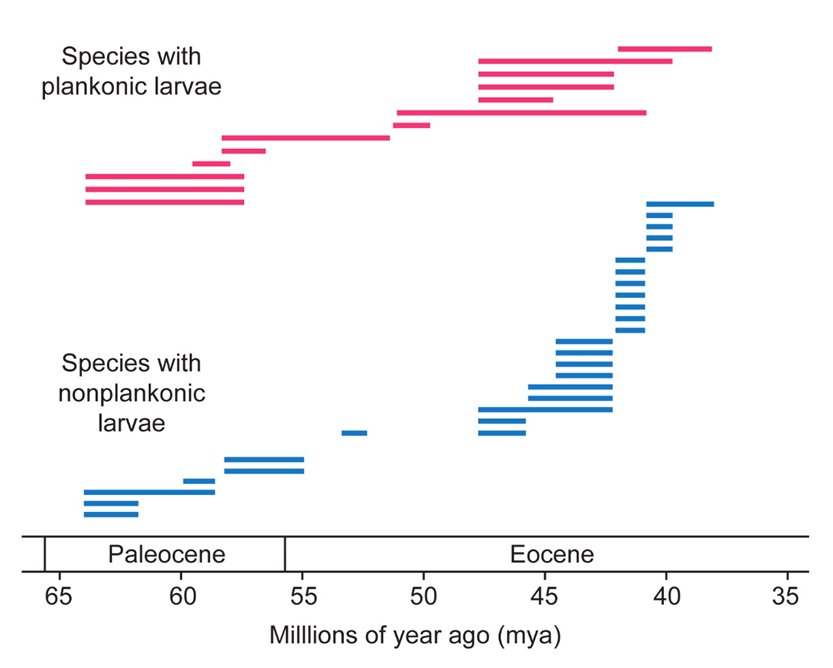 Calculate the mean (average) persistence times for species with planktonic larvae and species with nonplanktonic larvae.