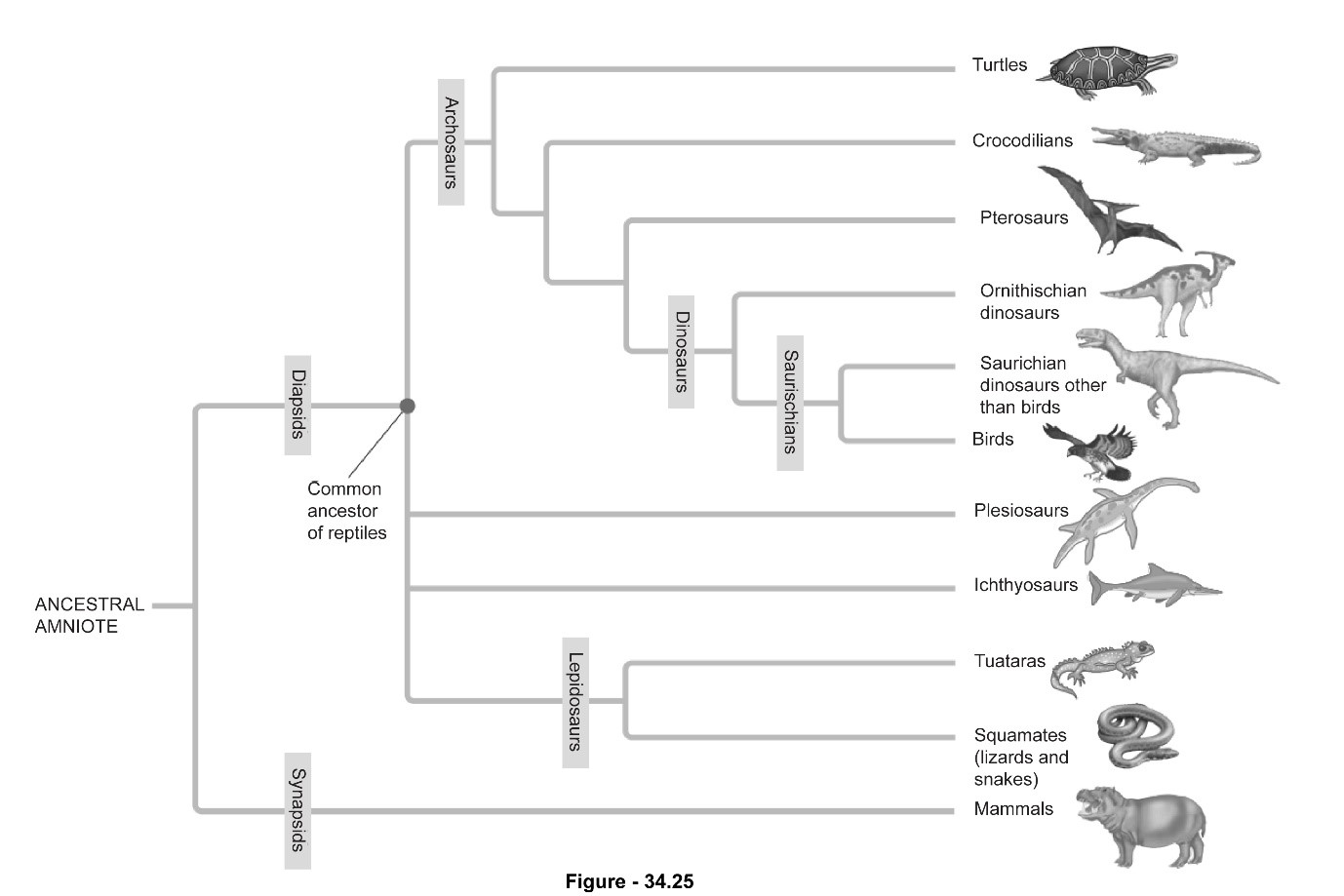 Based on the phylogeny shown in Figure 34.25, identify the sister group for (a) reptiles; (b) squamates; and (c) the clade that includes crocodilians and birds.