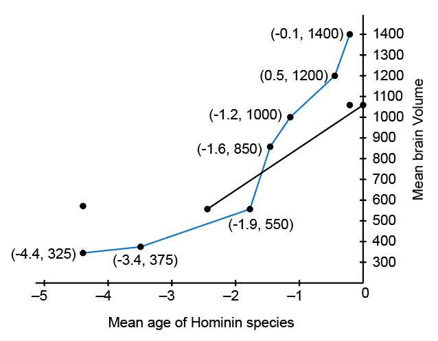 The equation for a regression line can be used to calculate the value of y expected for any particular value of x. For example, suppose that a linear regression indicated that m = 2 and b = 4. In this case, when x = 5. We expect that y= 2x + 4 = (2 × 5) + 4 = 14. Based on the values of m and b that you determined in question 4, use this approach to determine the expected mean brain volume for a hominin that lived 4 million years ago (that is, x = -4)