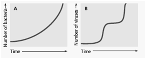 When bacteria infect an animal, the number of bacteria in the body increases in an exponential fashion (graph A). After infection by a virulent animal virus with a lytic replicative cycle, there is no evidence of infection for a while. Then the number of viruses rises suddenly and subsequently increases in a series of steps (graph B). Explain the difference in the curves.