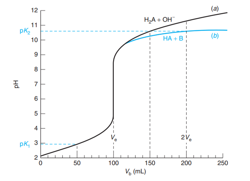 11-19. Sketch the general appearance of the curve for the titration of a weak diprotic acid withNaOH. What chemistry governs the pHin each distinct region of the curve?
