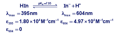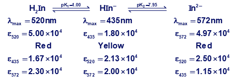 The units of molar absorptivity, ε, are M-1 cm-1. A solution containing 10.0 mL of 5.00 × 10-4 M indicator was mixed with 90.0 mL of 0.1 M phosphate buffer (pH 7.50). Calculate the absorbance of this solution at 435 nm in a 1.00-cm cell.