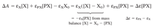 Experimental data are shown in cells A16-D20 in the spreadsheet on the next page. The authors report the increase in absorbance \((\Delta A)\) at 490 nm as P is added to X. X and PX absorb visible light, but P does not. Equilibrium expression 19-20 applies and (PX) is given by Equation 19-21. Before P is added, the absorbance is \({\varepsilon _X}{X_{0 - }}\). The increase in absorbance when P is added is