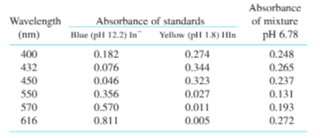 Two ways to analyze a mixture. Figure 19-5 shows the spectrum of the indicator bromothymol blue adjusted to several pH values. The spectrum at pHis that of the pure blue form and the spectrum at pH 1.8is that of the pure yellow form. At other pHvalues, there is a mixture of the two forms. The total concentration isand the path length isin all spectra. For the purpose of calculation, assume that there are more than two significant digits in concentration and path length. Absorbance at the dots on three of the curves in Figure 19-5 is given in the table.