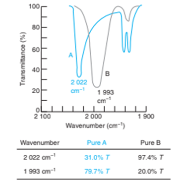 Infrared spectra are customarily recorded on a transmittance scale so that weak and strong bands can be displayed on the same scale. The region near in the infrared spectra of compounds A and B is shown in the figure. Note that absorption corresponds to a downward peak on this scale. The spectra were recorded from a 0.0100M solution of each, in cells with 0.00500 - cm path lengths. A mixture of A and B in a 0.00500 - cm cell gave a transmittance 34.0 % of at2022cm and 383% at 1093 cm. Find the concentrations of A and B.