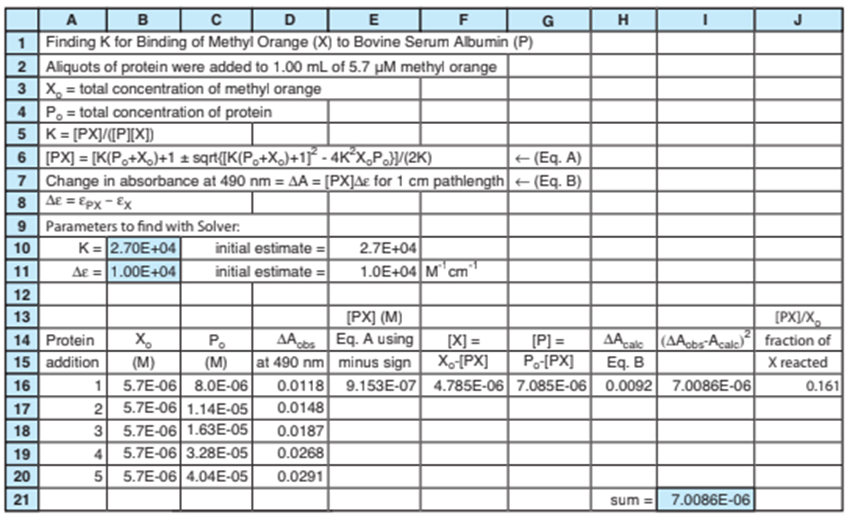 The spreadsheet uses Solver to vary K and \(\Delta E\) in cells B10:B11 to minimize the sum of squares of differences between observed and calculated \(\Delta A\) in solutions with different amounts of P. Cell E16 computes (PX) from Equation 19-21, which is Equation A on line 6 of the spreadsheet. Cells F16 and G16 find (X) and (P) from mass balances. Cell H16 computes \(\Delta {A_{calc}} = \Delta E(PX)\)which is Equation B on line 7.