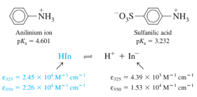 Challenging your acid-base prowess. A solution was prepared by mixing 25.00mL of 0.800Maniline, 25.00mLsulfanilic acid, andand then diluting to 100.0mL. (stands for protonated indicator.)