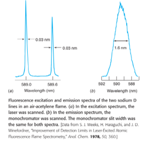 Laser atomic fluorescence excitation and emission spectra of sodium in an air-acetylene flame are shown here. In the excitation spectrum, the laser (linewidth 5 0.03 nm) was scanned through various wavelengths, while the detector monochromator (bandwidth 5 1.6 nm) was held fixed near 589 nm. In the emission spectrum, the laser was fixed at 589.0 nm, and the detector monochromator wave-length was varied. Explain why the emission spectrum gives one broad band, whereas the excitation spectrum gives two sharp lines. How can the excitation linewidths be much narrower than the detector monochromator bandwidth?