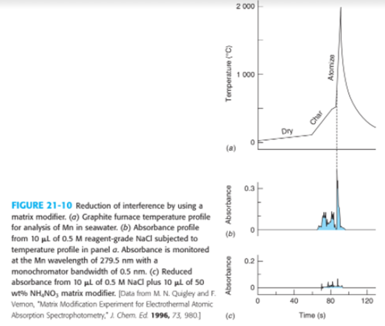 Figure 21 - 10shows a temperature profile for a furnace atomic absorption experiment. Explain the purpose of each different part of the heating profile.
