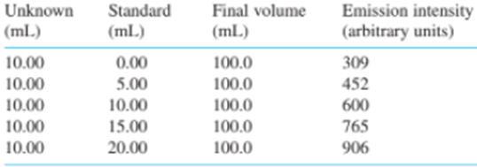 Li was determined by atomic emission with the method of standard addition. Prepare a standard addition graph (Section 5 - 3) to find the concentration of Li and its uncertainty in pure unknown. The Listandard contained .