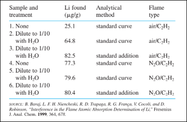 The measurement of Li in brine (salt water) is used by geochemists to help determine the origin of this fluid in oil fields. Flame atomic emission and absorption of Li are subject to interference by scattering, ionization, and overlapping spectral emission from other elements. Atomic absorption analysis of replicate samples of a marine sediment gave results in the table.