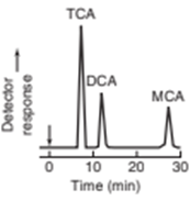 In ion-exclusion chromatography, ions are separated from nonelectrolytes by an ion-exchange column. Nonelectrolytes penetrate the stationary phase, whereas ions of the same charge as the resin are repelled by the fixed charges. Because co-ions have access to less of the column volume, electrolytes are eluted before nonelectrolytes. The chromatogram shows the separation of trichloroacetic acid (TCA,), dichloroacetic acid (DCA,), and monochloroacetic acid (MCA,) by passage through a cation-exchange resin eluted with 0.01 M HCl. Explain why the three acids are separated and why they emerge in the order shown.