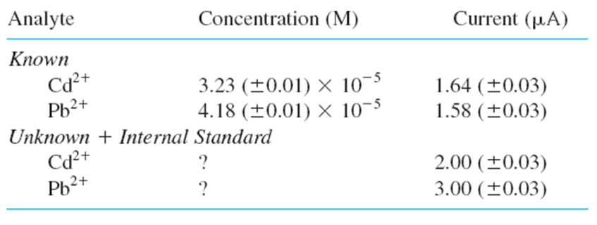 was used as an internal standard in the analysis of by square wave polarography. gives a reduction wave at -0.60 V and gives a reduction wave at –0.40 V. It was first verified that the ratio of peak heights is proportional to the ratio of concentrations over the whole range employed in the experiment. Here are results for known and unknown mixtures: