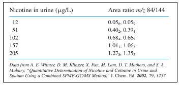 Here is a student procedure to measure nicotine in urine. A 1.00-mL sample of biological fluid was placed in a 12-mL vial containing powder. After of the internal standard 5 -aminoquinoline were injected, the vial was capped with a Teflon coated silicone rubber septum. The vial was heated to for 20 min and then a solid-phase microextraction needle was passed through the septum and left in the headspace for 5.00min. The fiber was retracted and inserted into a gas chromatograph. Volatile substances were desorbed from the fiber at for 9.5min in the injection port while the column was at . The column temperature was then raised to at and eluate was monitored by electron ionization mass spectrometry with selected ion monitoring at m/z 84 for nicotine and m / z 144 for internal standard. Calibration data from replicate standard mixtures taken through the same procedure are given in the table.