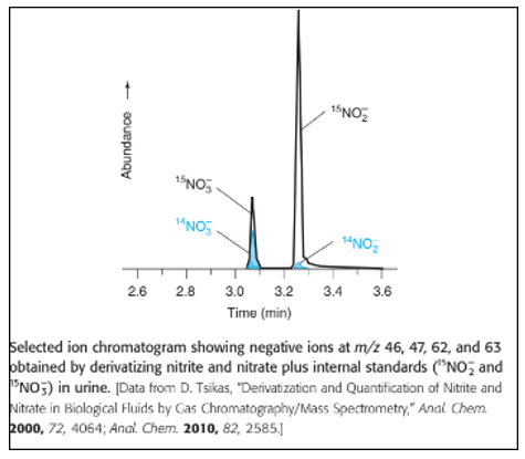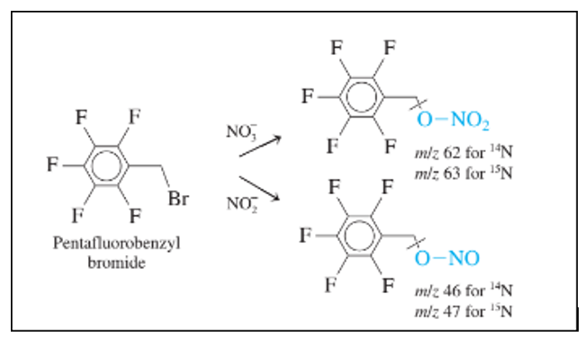 Nitric oxide (NO) is a cell-signaling agent in physiologic processes including vasodilation, inhibition of clotting, and inflammation. A sensitive chromatography-mass spectrometry method was developed to measure two of its metabolites, nitriteand nitrat,in biological fluids. Internal standards,and, were added to the fluid at concentrations of 80.0 and, respectively.Naturalandplus the internal standards were then converted to volatile derivatives: