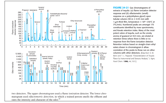 In the analysis of odorants in tequila in Figure 24-21, tequila was diluted with water and extracted four times with dichloromethane , b.p. Theofwas evaporated down toandof the extract was injected on-column onto a poly(ethylene glycol) open tubular column , film thickness ) initially at and then ramped to