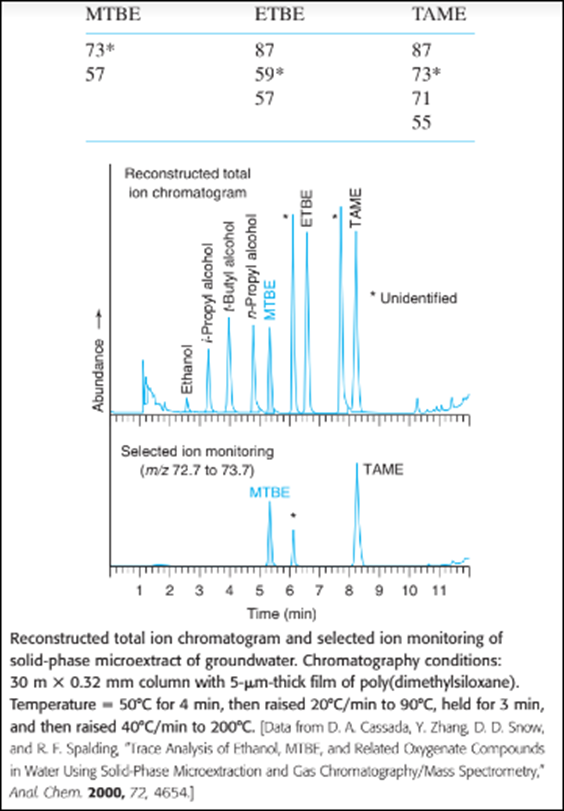 The gasoline additive methyl t-butyl ether (MTBE) has been leaking into groundwater ever since its introduction in the. MTBE can be measured at parts per billion levels by solid-phase microextraction from groundwater to which 25 % (wt/vol) NaCl has been added (salting out, Problem 8-9). After microextraction, analytes are thermally desorbed from the fiber in the port of a gas chromatograph. The figure on the next page shows a reconstructed total ion chromatogram and selected ion monitoring of substances desorbed from the extraction fiber.