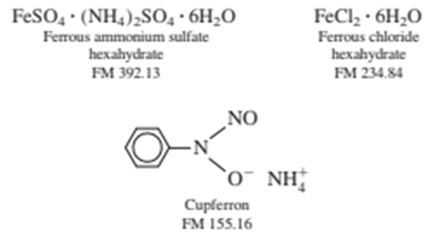 A solid mixture weighing 0.5485 gcontained only ferrous ammonium sulfate hexahydrate and ferrous chloride hexahydrate. The sample was dissolved in , oxidized to with , and precipitated with cupferron. The ferric cupferron complex was ignited to produce 0.1678 gof ferric oxide, (FM 159.69). Calculate the weight percent of Clin the original sample.