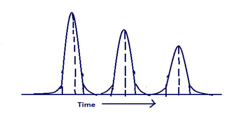 The three chromatograms shown here obtained with 2.5, 1.0 and 0.4 of ethyl acetate injected on the same column under the same conditions. Explain why the peak becomes less symmetrical with increasing sample size.