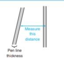 (b)Using the width of the toluene peak at its base, calculate the width expected at half height. Compare the measured and calculated values. When the thickness of the the line is significant relative to the length being measured, it is important to take the pen line width into account. You can measure from the edge of one line to the corresponding edge of the other line,as shown here.