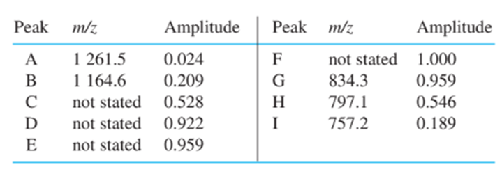 38: An electrospray–transmission quadrupole mass spectrum of the a chain of hemoglobin from acidic solution exhibits nine peaks corresponding to MHn1n . Find the charge, n, for peaks A–I. Calculate the molecular mass of the neutral protein, M, from peaks A, B, G, H, and I, and find the mean value.
