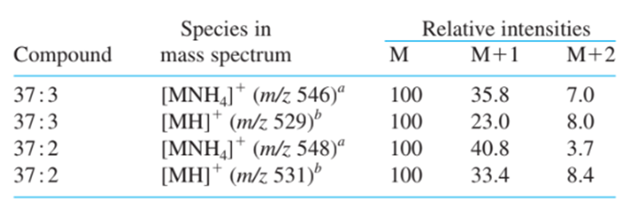 After they die, plankton sink to the ocean fl oor and end up buried insediment. The deeper we sample a sediment, the further back into time we delve. By measuring the relative quantities of cell-membrane compounds at different depths in the sediment, we can infer the temperature of the ocean long ago. The molecular ion regions of the chemical ionization mass spectra of 37:2 and 37:3 are listed in the table. Predict the expected intensities of M, M11, and M12 for each of the four species listed. Include contributions from C, H, O, and N, as appropriate. Compare your predictions with the observed values. Discrepant intensities in these data are typical unless care is taken to obtain high-quality data.