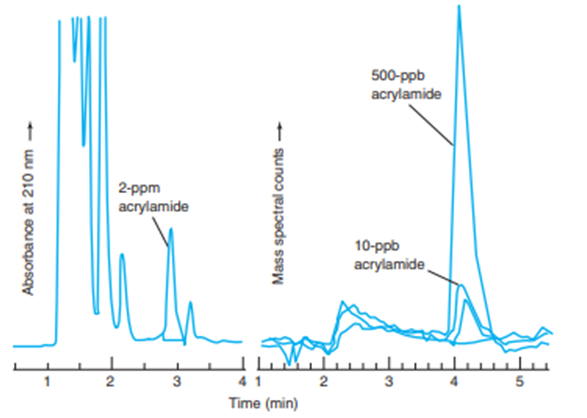 After the discovery, simplified methods were developed to measure ppm levels of acrylamide in food. In one procedure,\(10\;{\rm{g}}\) of pulverized, frozen french fries were mixed for \(20\;{\rm{min}}\)with\(50\;{\rm{mL}}\) of \({{\rm{H}}_2}{\rm{O}}\)to extract acrylamide, which is very soluble in water \((216\;{\rm{g}}/100\;{\rm{mL}}).\)The liquid was decanted and centrifuged to remove suspended matter. The internal standard \(^2{{\rm{H}}_3}\)-acrylamide was added to\(1\;{\rm{mL}}\) of extract. A solid-phase extraction column containing \(100{\rm{mg}}\)of cation-exchange polymer with protonated sulfonic acid groups\(\left( { - {\rm{S}}{{\rm{O}}_3}{\rm{H}}} \right.)\) was washed twice with 1 -mL portions of methanol and twice with \(1 - {\rm{mL}}\)portions of water. The aqueous food extract \((1{\rm{mL}})\)was then passed through the column to bind protonated acrylamide \(\left( { - {\rm{NH}}_3^ + } \right)\)to sulfonate \(\left( { - {\rm{SO}}_3^ - } \right)on\)the column. The column was dried for\(30\;{\rm{s }}at\)\(0.3\)bar and then acrylamide was eluted with\(1\;{\rm{mL}}\) of \({{\rm{H}}_2}{\rm{O}}.\)Eluate was analyzed by liquid chromatography with a polar bonded phase. The chromatograms show the results moni- tored by ultraviolet absorbance or by mass spectrometry. The retention time of acrylamide is different on the two columns because they have different dimensions and different flow rates.