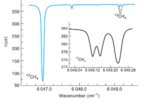 (b) The ring-down spectrum below arises from and from of methane in outdoor air at 0.13. The spectrum arises from individual rotational transitions of the ground vibrational state to a second excited C-H)vibrational state of the molecule. (i) Explain what quantity is plotted on the ordinate ( Y-axis). (ii) The peak foris at. What is the wavelength of this peak in? What is the name of the spectral region where this peak is found?