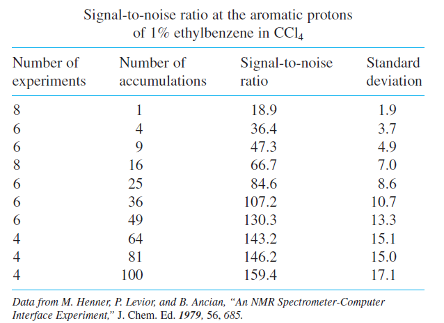 (b) signal-to-noise ratio versus , where n is the number of scans. Draw error bars corresponding to the standard deviation at each point. Is the signal-to-noise ratio proportional to ? Find the 95% confidence interval for each row of the table.